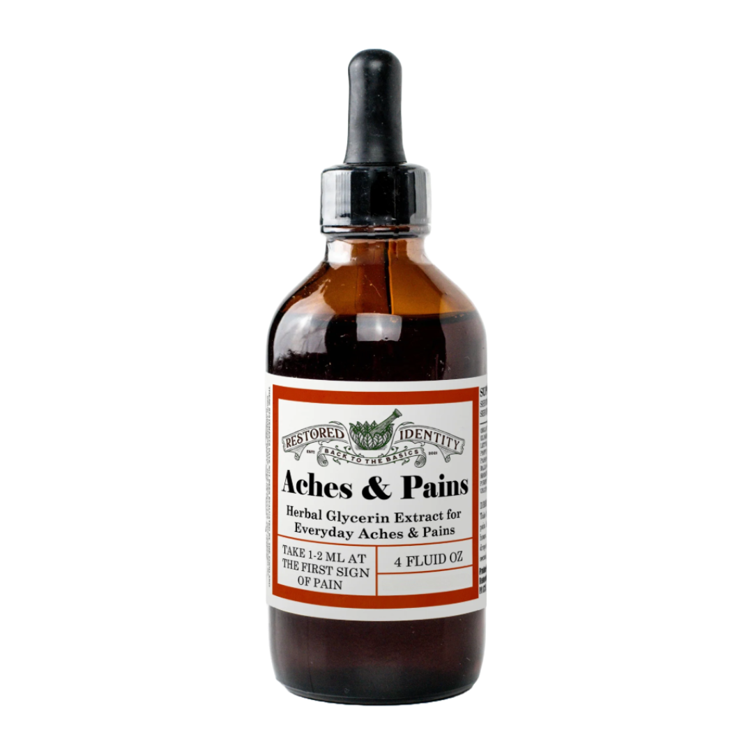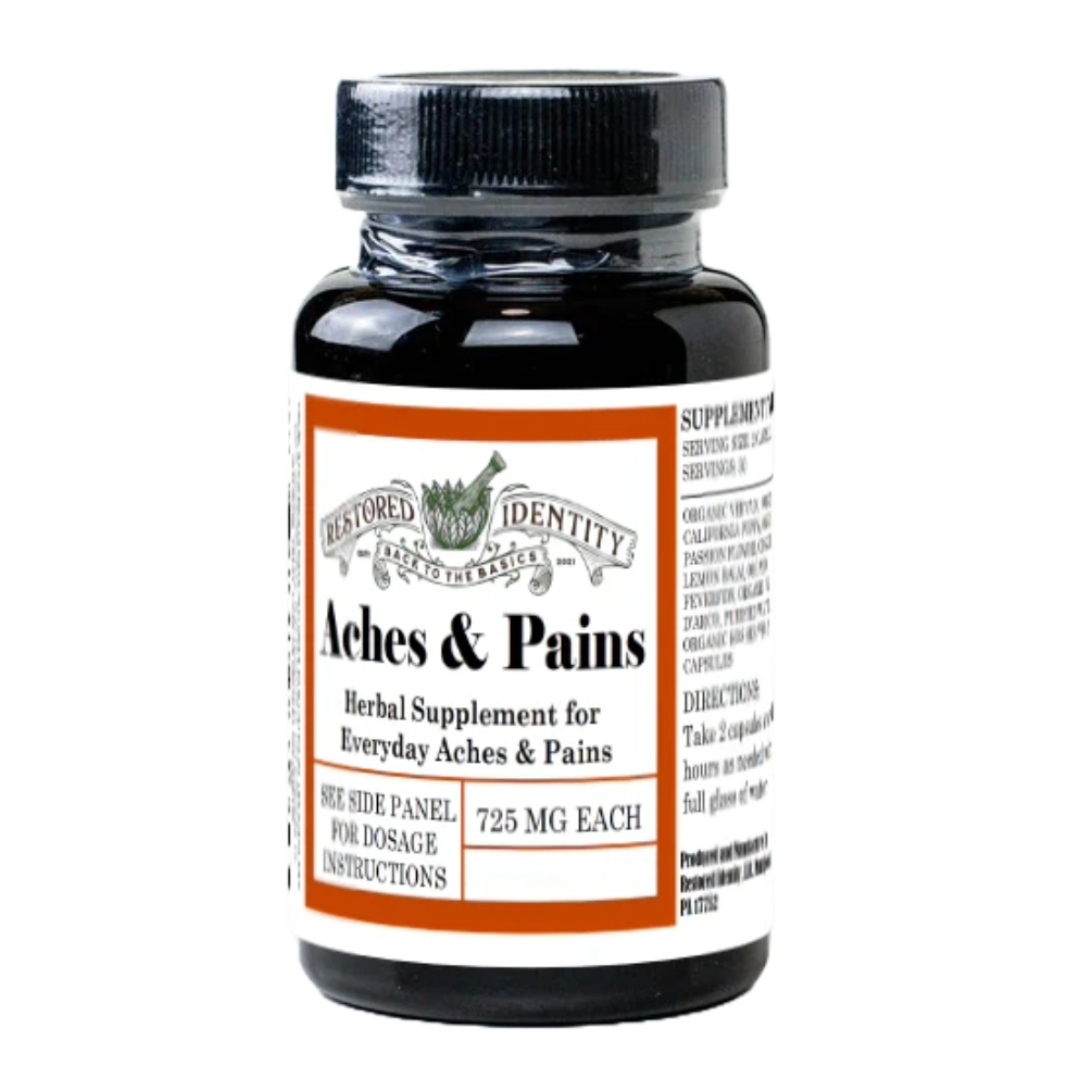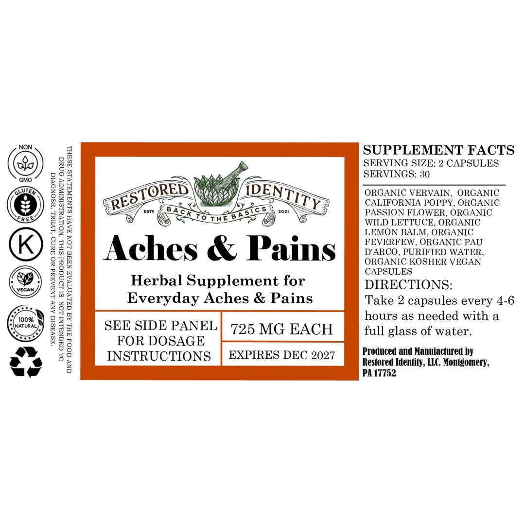 Try Restored Identity's all-organic Aches & Pain Blend with Organic Feverfew, Organic Vervain, Organic Elderberry, Organic Passionflower, Organic Lemon Balm, Organic Skullcap, Organic Horsetail, California Poppy, Wild Lettuce and Organic Pau d’Arco!