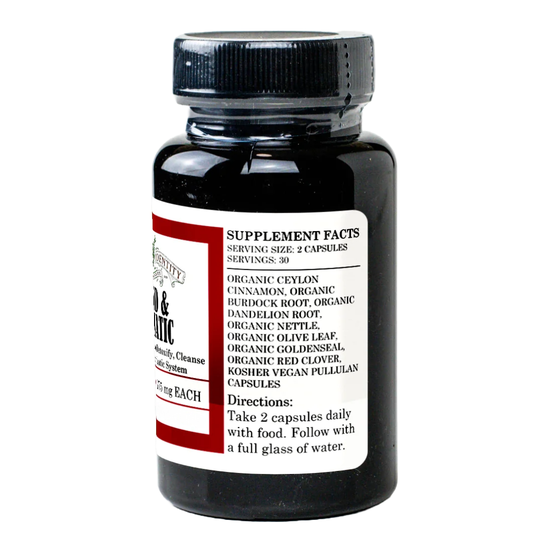 Ingredients: Ceylon Cinnamon, Burdock Root, Dandelion Root, Nettle, Olive Leaf, Goldenseal, Red Clover, Kosher Vegan Capsules. 675mg each.